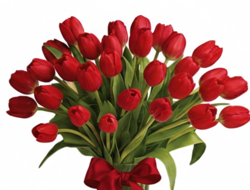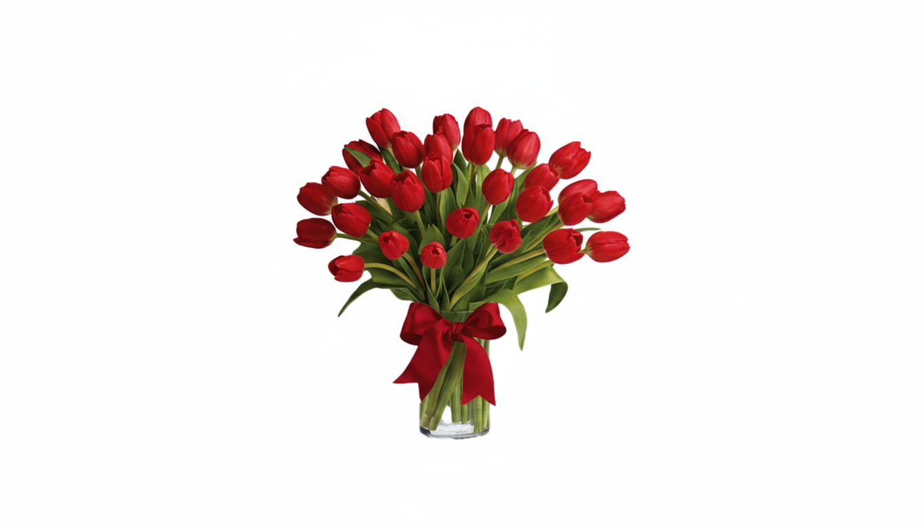 A stunning, hand-arranged display featuring 31 Red tulips. Symbolizing love and purity, this elegant arrangement comes perfectly placed in a stylish glass vase, finished with a classic red ribbon. It is ready to display immediately upon arrival. Perfect for Valentine’s Day, anniversaries, birthdays, or a thoughtful surprise.