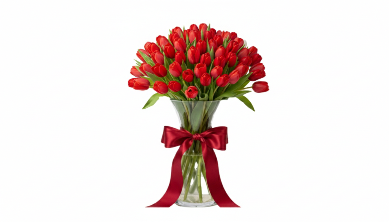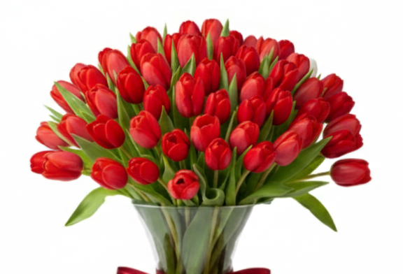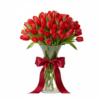A stunning, hand-arranged display featuring 51 red tulips. Symbolizing love and purity, this elegant arrangement comes perfectly placed in a stylish glass vase, finished with a classic red ribbon. It is ready to display immediately upon arrival. Perfect for Valentine’s Day, anniversaries, birthdays, or a thoughtful surprise.